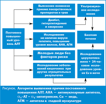 Для исключения заболеваний желчевыводящих путей проводится ультразвуковое исследование. Гипотензия, сепсис, ишемическая болезнь сердца и алкоголизм должны быть исключены или выявлены перед установкой окончательного диагноза. Также необходимо исключить наследственную недостаточность ферментных систем печени. Уровень аминотрансфераз увеличивается при повреждении паренхимы печени различной этиологии: вирусный гепатит, лекарственные препараты или их метаболиты, аутоиммунный гепатит, и некоторые инфильтративные нарушения, как гемохроматоз, дефицит α1антитрипсина и жировая дистрофия печени. Конечно, при некоторых заболеваниях могут быть также в некоторой степени повышены щелочная фосфатаза и гаммаглутамилтранспептидаза, но в случае отсутствия обструкции желчных путей или наличия значительного нарушения функционирования печени уровень билирубина остается нормальным. Наиболее распространенной причиной повышения аламинаминотрансферазы (АЛТ) является токсичность лекарственных средств.
