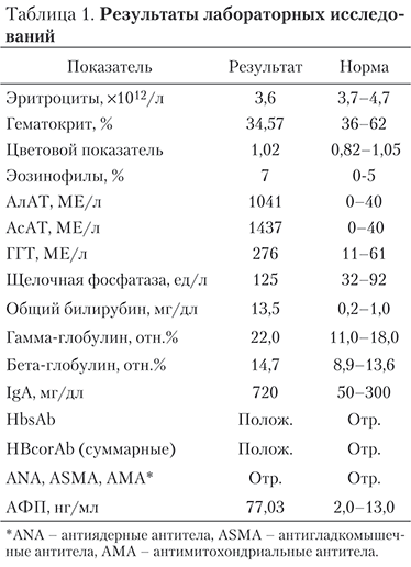 Клинический анализ крови: небольшое уменьшение количества эритроцитов, гиперхромия и эозинофилия (табл. 1). Биохимические тесты: повышение активности сывороточных трансами-наз - АлАТ до 1041 МЕ/л (в 26 раз) и АсАТ до 1437 МЕ/л (в 36 раз), при этом коэффициент де Ритиса составлял более 1. Кроме того, выявлены лабораторные признаки холестаза в виде повышения активности ГГТ, увеличения содержания щелочной фосфатазы и общего билирубина за счет прямой фракции. Показатели коагулограм-мы оставались в пределах нормальных значений, что свидетельствовало о сохраненной функции печени. Из маркеров вирусных гепатитов обнаружены HBsAb и НВсогАЬ (суммарные). Такой серологический профиль свидетельствовал о приобретенном иммунитете к вирусу гепатита В. Все реакции на аутоиммунные маркеры были отрицательными. Таким образом, нами был исключен вирусный и аутоиммунный гепатит.Поскольку причиной холестаза могло быть новообразование гепатобилиарной зоны, были исследованы онкомаркеры, в том числе альфа-фетпопротпеин (АФП), уровень которого оказался незначительно повышенным, что мы объясняли высокой степенью регенерации клеток печени на фоне активного воспалительного процесса.