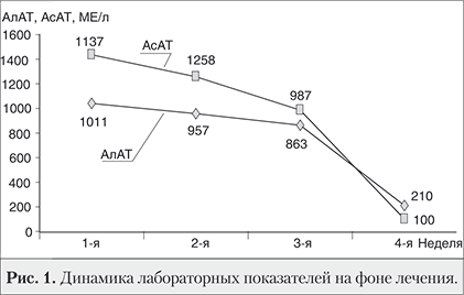 Под влиянием лечения, которое проводили в течение 4 нед, у пациентки регрессировали астенический синдром, желтуха, кожный зуд и отмечена выраженная положительная динамика лабораторных показателей.