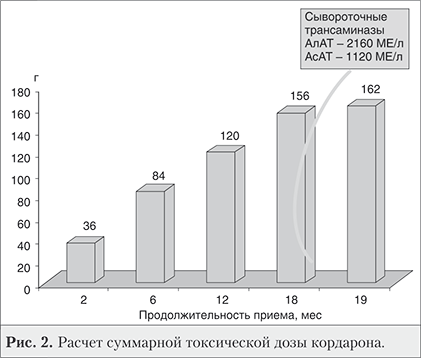 Несмотря на то что больная принимала кордарон в течение 13 мес в минимальной поддерживающей дозе (200 мг/сут), не была исключена возможность развития тяжелого лекарственного поражения печени. Анализ данных литературы дает основание предполагать, что не столько суточная, сколько кумулятивная доза препарата за весь период лечения является определяющим фактором в развитии повреждения печени [7]. В связи с этим мы рассчитали суммарную дозу кордарона, при приеме которой началось повышение уровня сывороточных трансаминаз и билирубина у нашей больной: она составила 156 г.